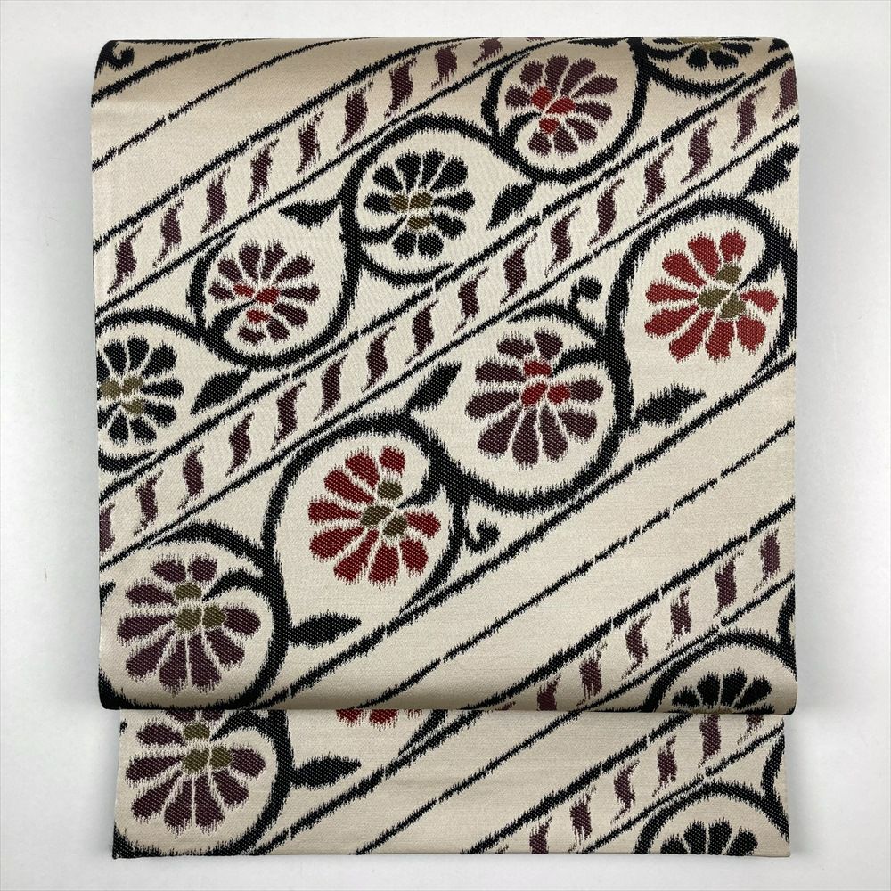 (中古)袋帯 生成り カジュアル ヴィンテージ 六通 斜め取り 蔓 花