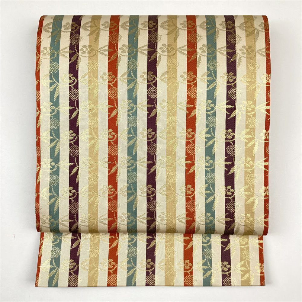 (中古)袋帯 クリーム オレンジ 緑 紫 ベージュ 多色縞 セミフォーマル 金糸 間道 笹蔓 全通