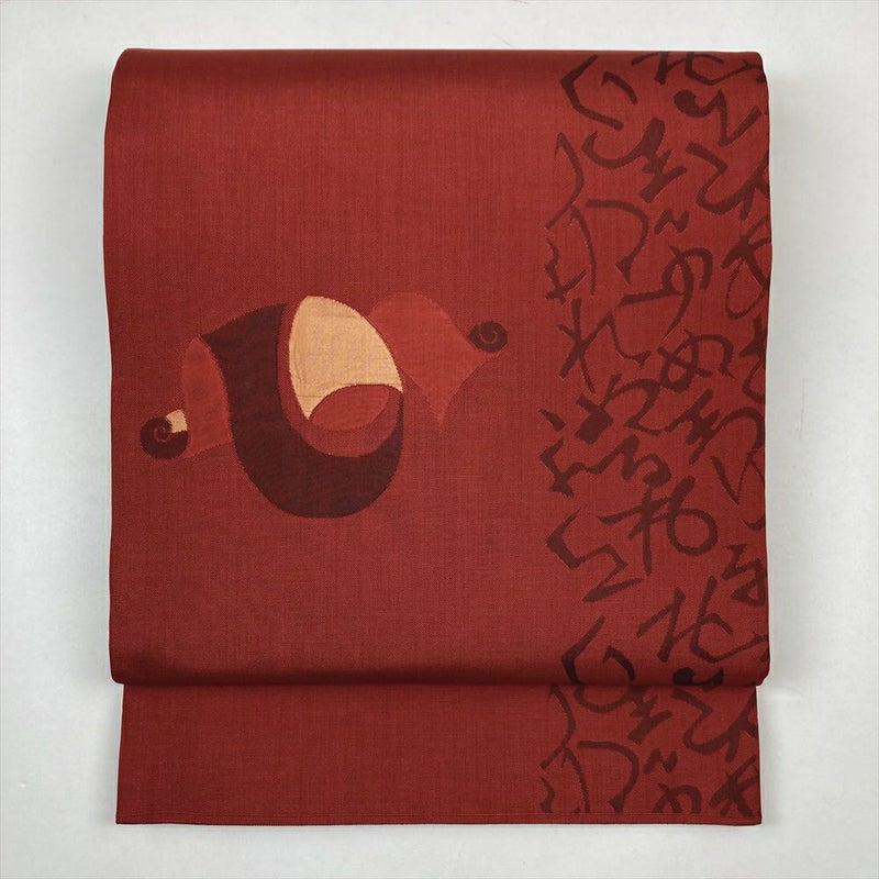 (中古)袋帯 赤 カジュアル 六通 文字 反物柄