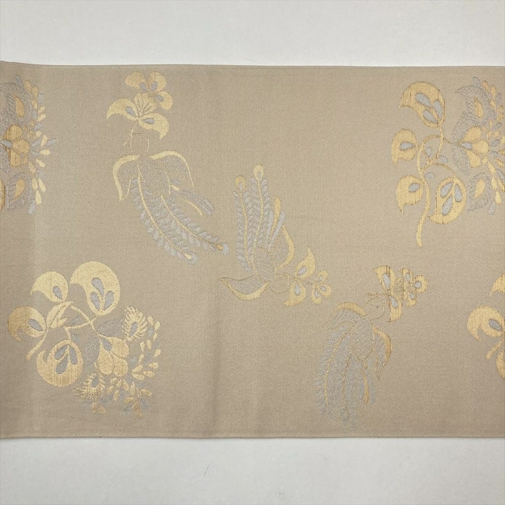 (中古)袋帯 ベージュ セミフォーマル カジュアル 全通 金糸 紹巴 花喰い鳥 オリエンタル