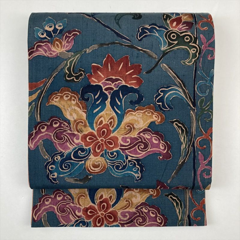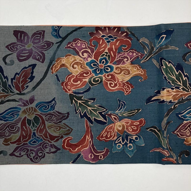(中古)袋帯 紺 カジュアル 六通 型絵染め ぼかし染め 蔓花 オリエンタル