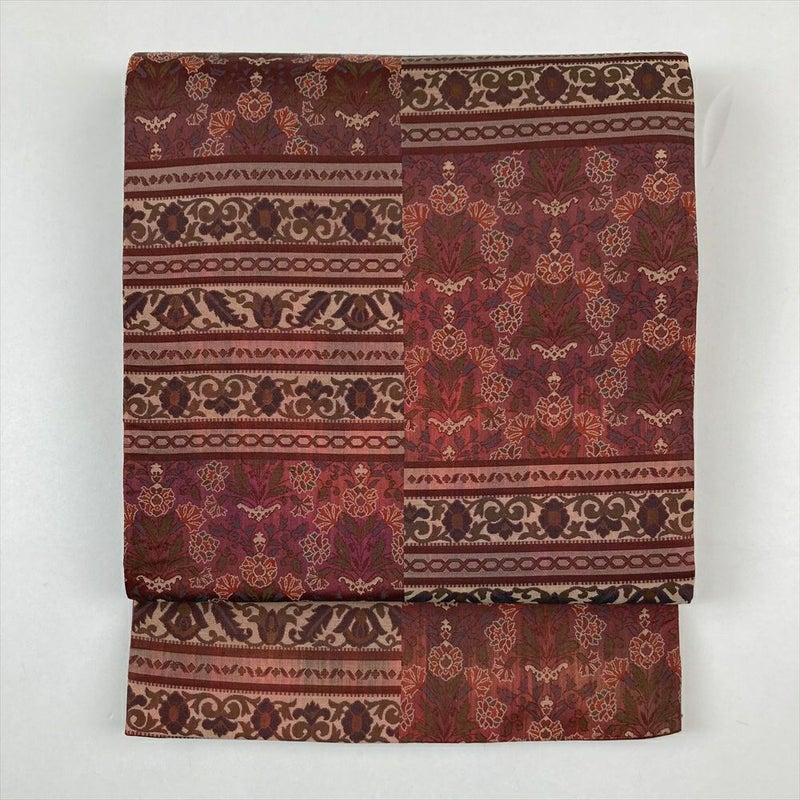 (中古)袋帯 濃赤 カジュアル 六通 変わり市松 花 蔓葉