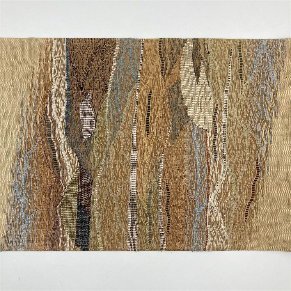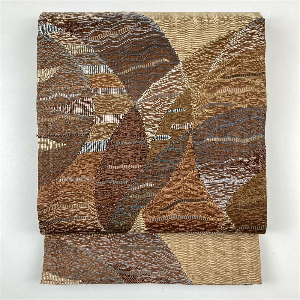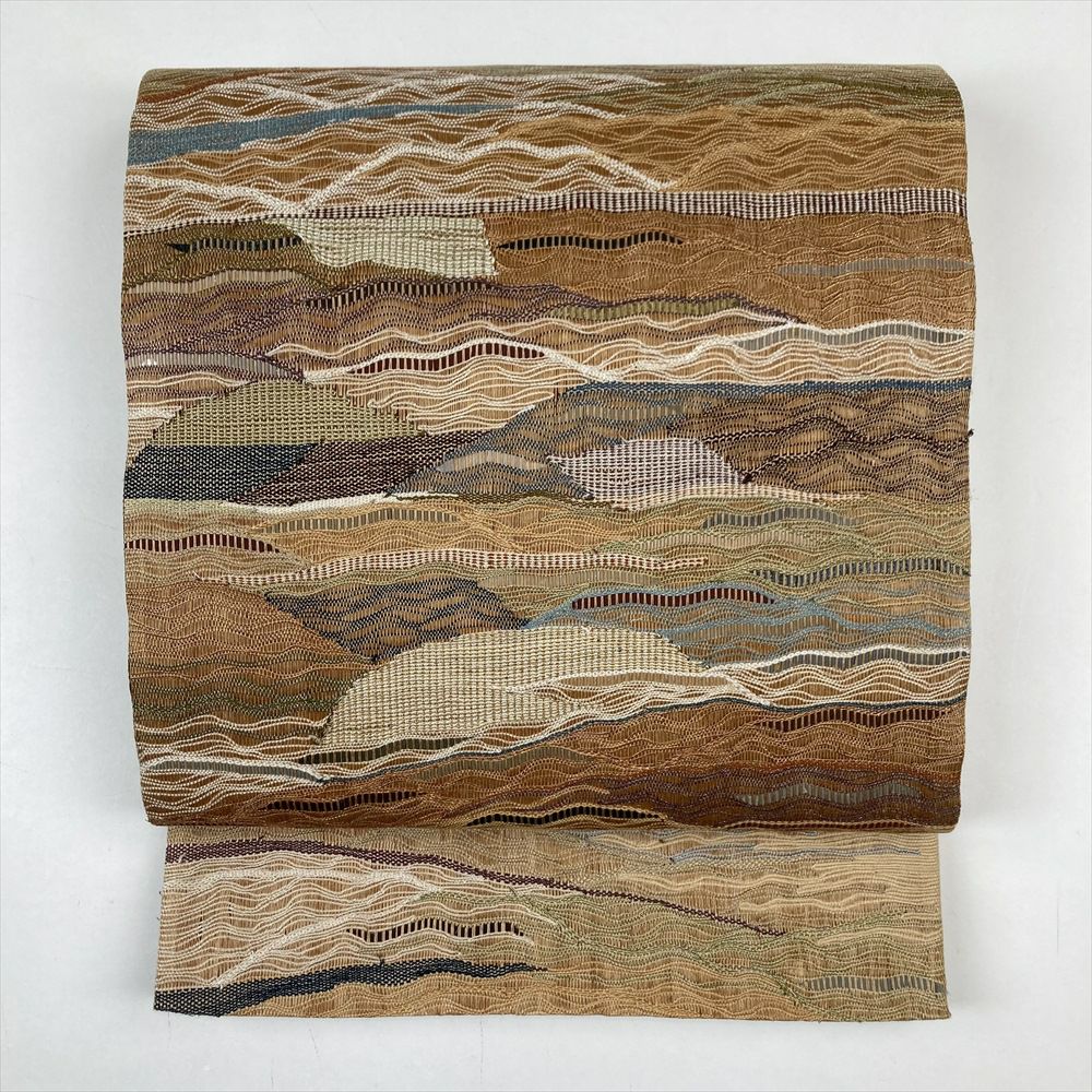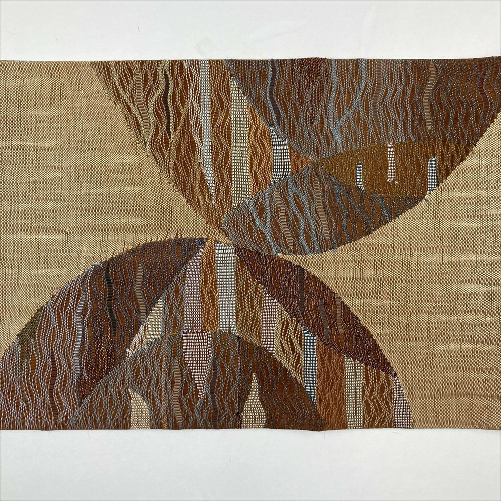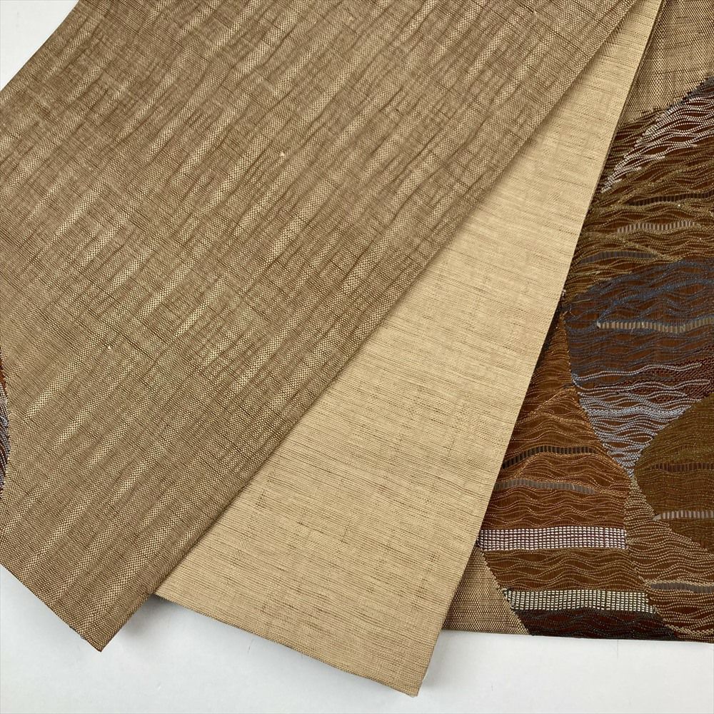 (中古)袋帯 茶 カジュアル リバーシブル 六通 透かし織り 丸に波