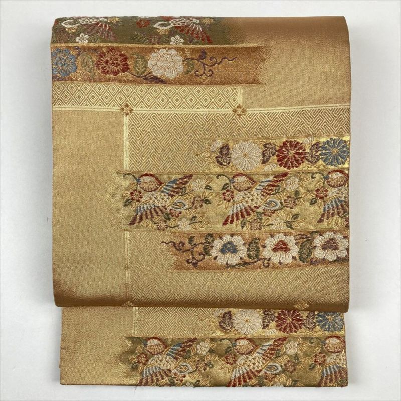 (中古)袋帯 金 フォーマル 六通 金糸 花喰い鳥 蔓牡丹 菊 違い棚 紗綾型 菱 網代