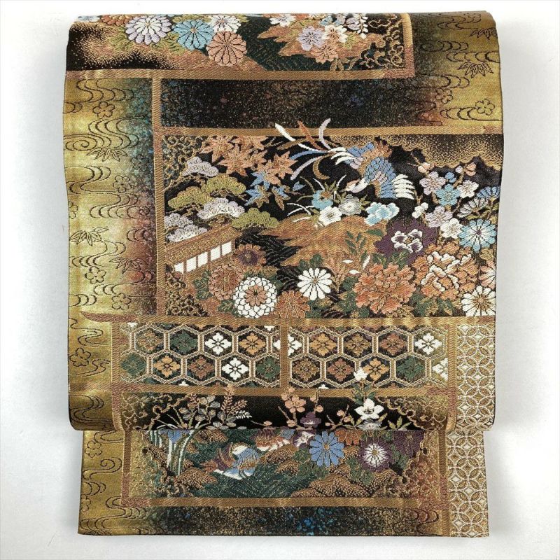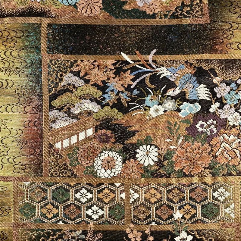 (中古)袋帯 金 フォーマル セミフォーマル 六通 金糸 色糸 違い棚 鳳凰 牡丹 菊 菖蒲 藤 梅 萩