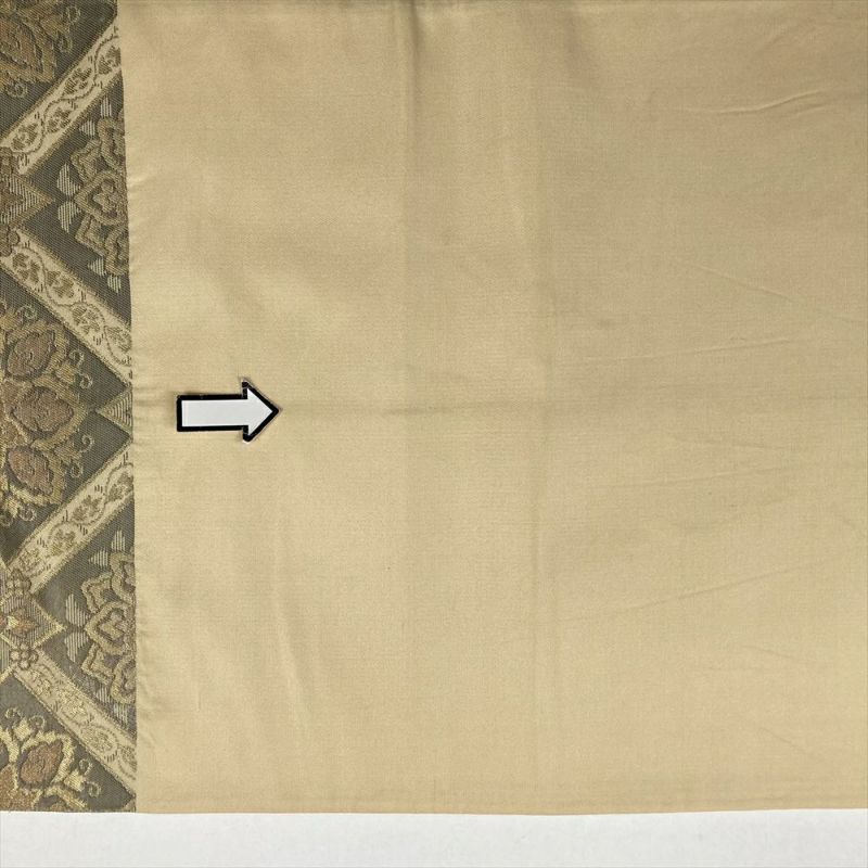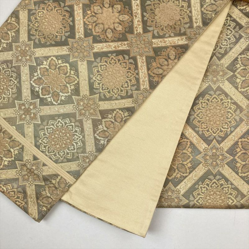 控えめに輝く金系の帯です。フォーマル、セミフォーマルシーンにおすすめいたします。お好きなコーディネートをお楽しみくださいませ。締め跡や使用感が見られます。中無地に汚れが見られます。