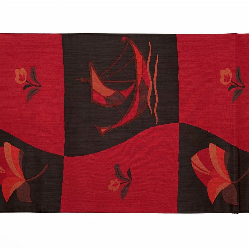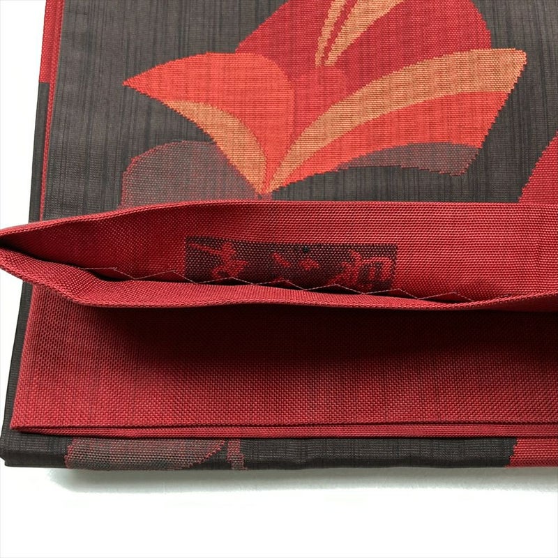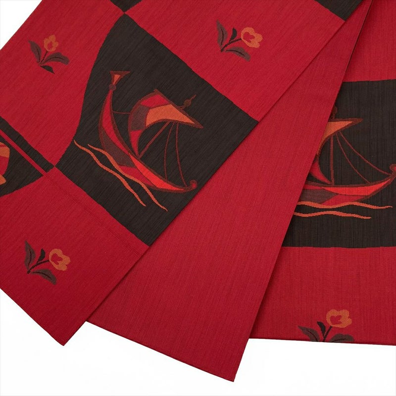 (中古)袋帯 赤 カジュアル 六通 切り嵌め 舟 花