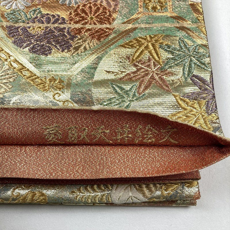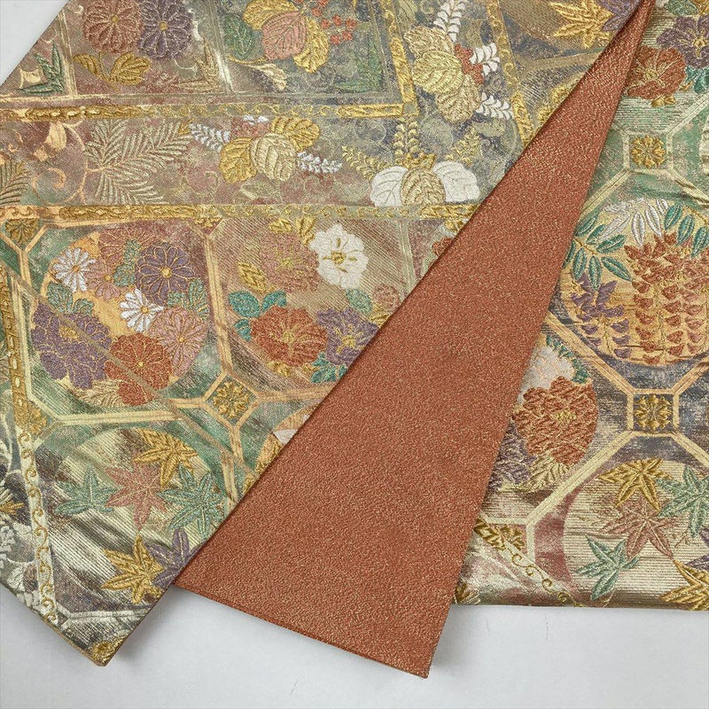 (中古)袋帯 金 フォーマル 六通 金糸 色糸 斜め取り 蜀江 花の丸 若松 桐 笹 菊 紅葉