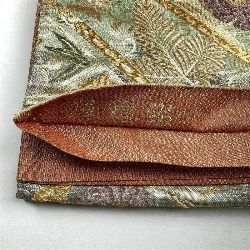 金色が強く煌めきます。フォーマルシーンにおすすめいたします。お好きなコーディネートをお楽しみくださいませ。たれ裏地に文字あり。締め跡など若干の使用感はありますが着用に問題はございません。