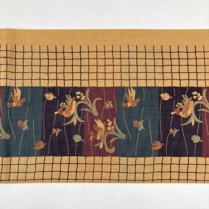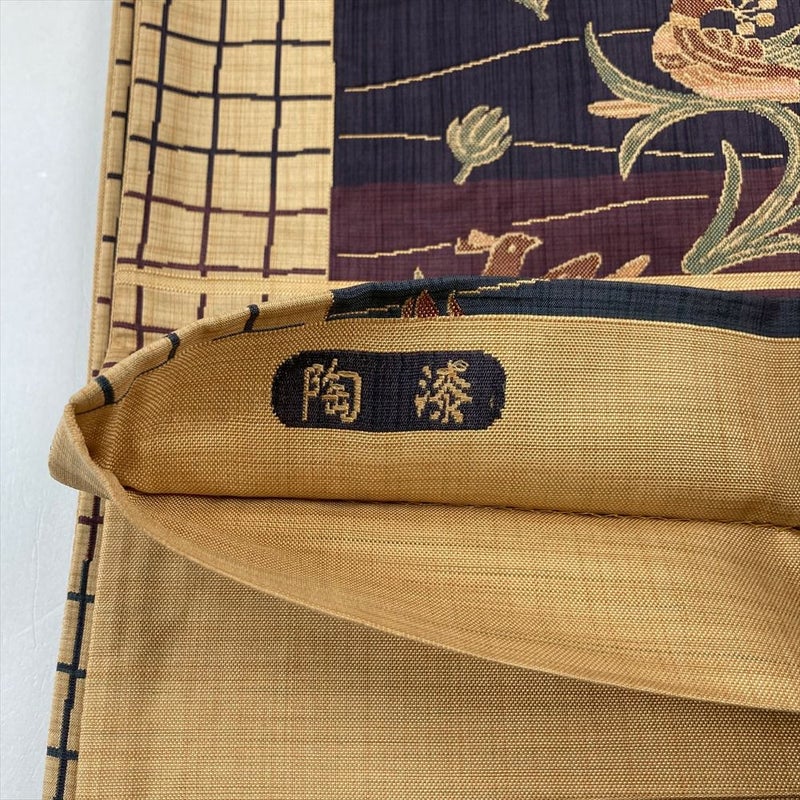 (中古)袋帯 金茶 カジュアル 六通 変わり格子 花鳥 水辺