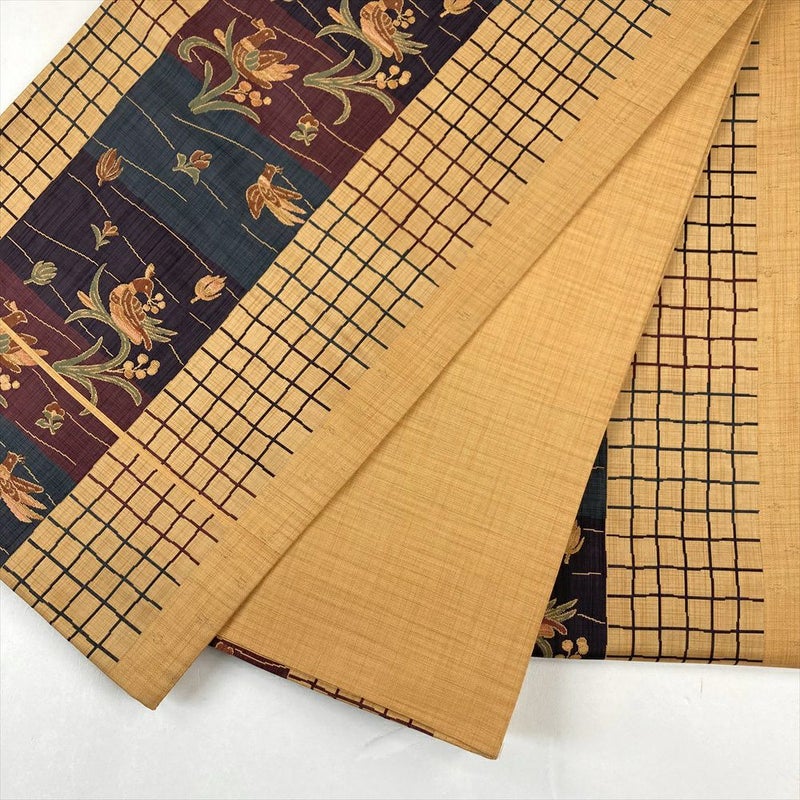 【色柄】金茶 カジュアル 六通 変わり格子 花鳥 水辺