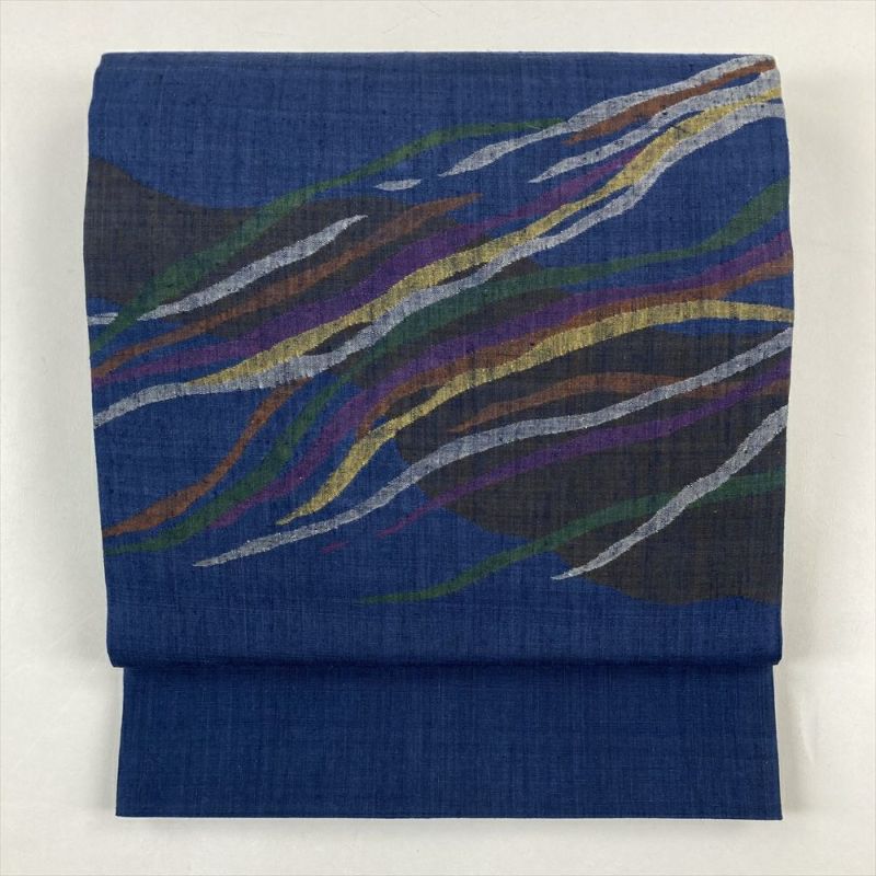 (中古)袋帯 青 カジュアル 紬 六通 霞取り 吹き流し