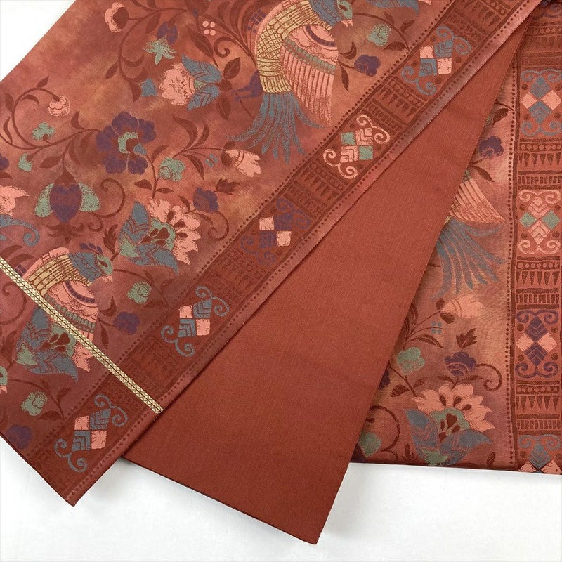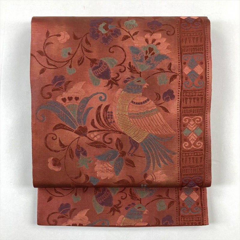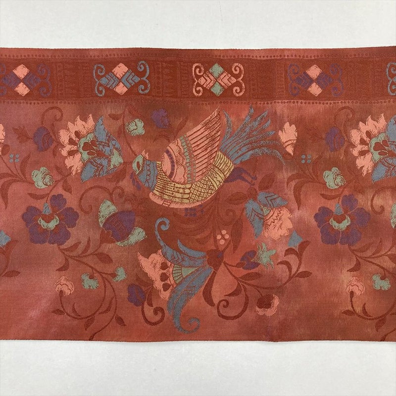 (中古)袋帯 赤 カジュアル 六通 唐花 鳥