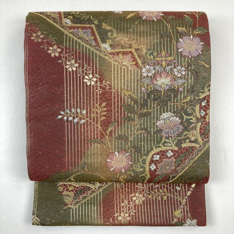 (中古)袋帯 臙脂 カーキ フォーマル セミフォーマル 六通 金糸 変わり縞 干割れ 唐花 グラデーション オリエンタル