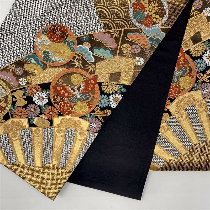 (中古)袋帯 黒 金 フォーマル セミフォーマル 六通 切箔 金糸 銀糸 丸文に花蝶 源氏車 吉祥文 宝尽くし 疋田