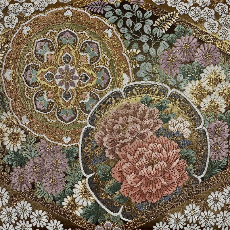 金系の帯は上品な光沢と高級感があります。フォーマルな着物に合わせると華やかさが引き立ち、セミフォーマルな着物に合わせると格調高さをプラスすることができます。たれ先に縫い取りあり若干の使用感がございます。