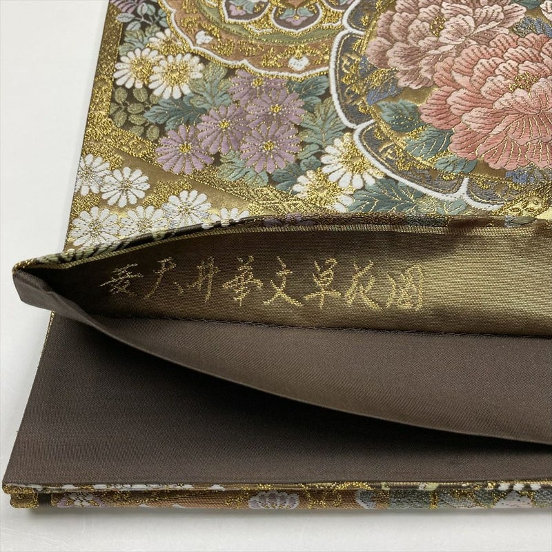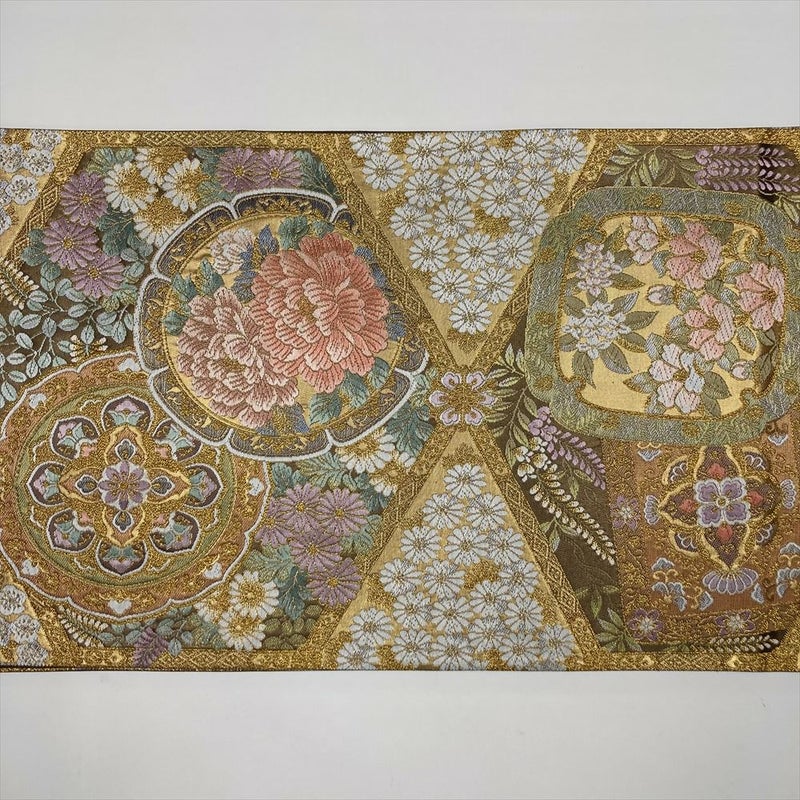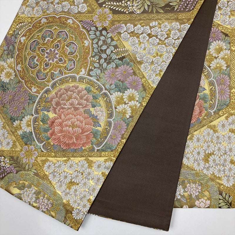 (中古)袋帯 金 茶 フォーマル セミフォーマル 六通 金糸 色糸 格天井 鏡裏 宝華文