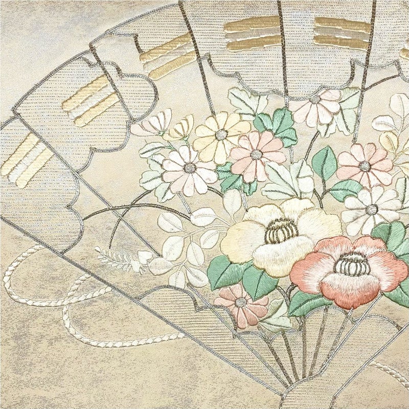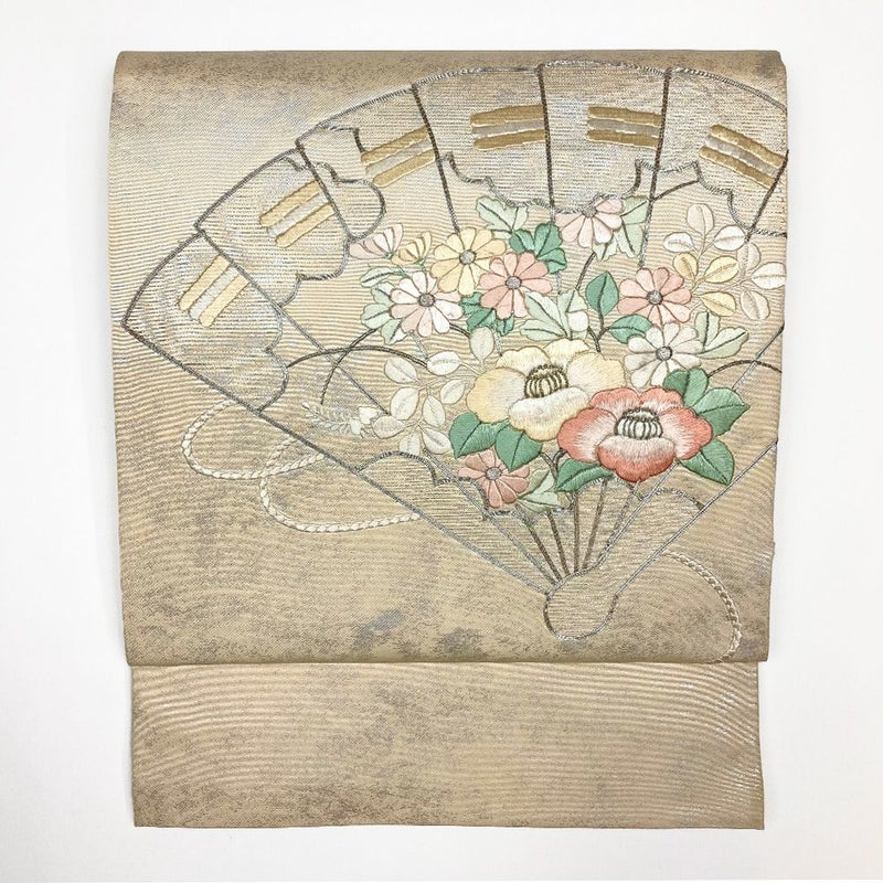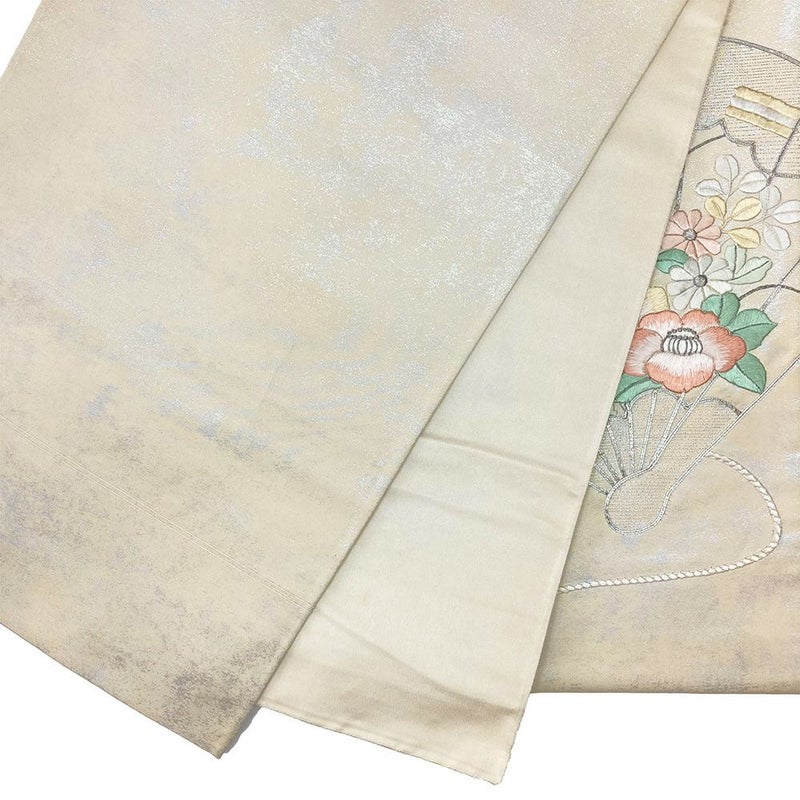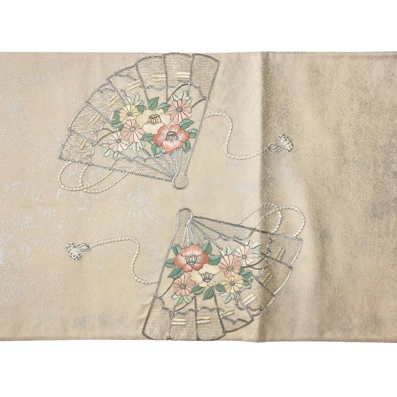 (中古)袋帯 生成り フォーマル セミフォーマル 六通 刺繍 檜扇に四季花