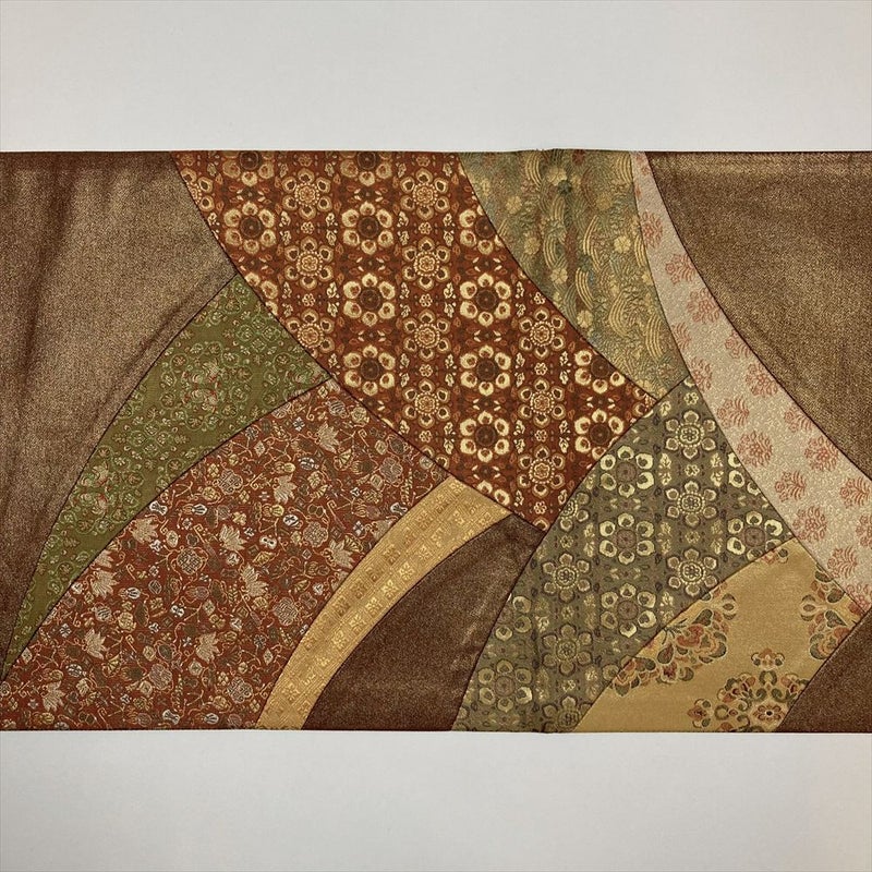 (中古)袋帯 茶 フォーマル セミフォーマル 六通 切り嵌め 切箔 華文 波に花 名物裂