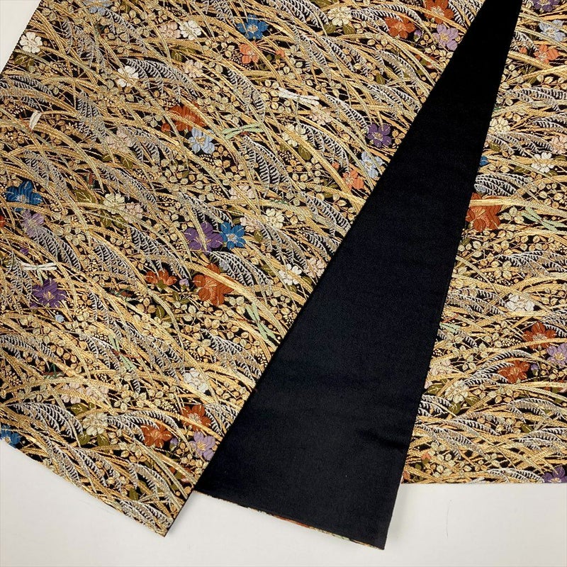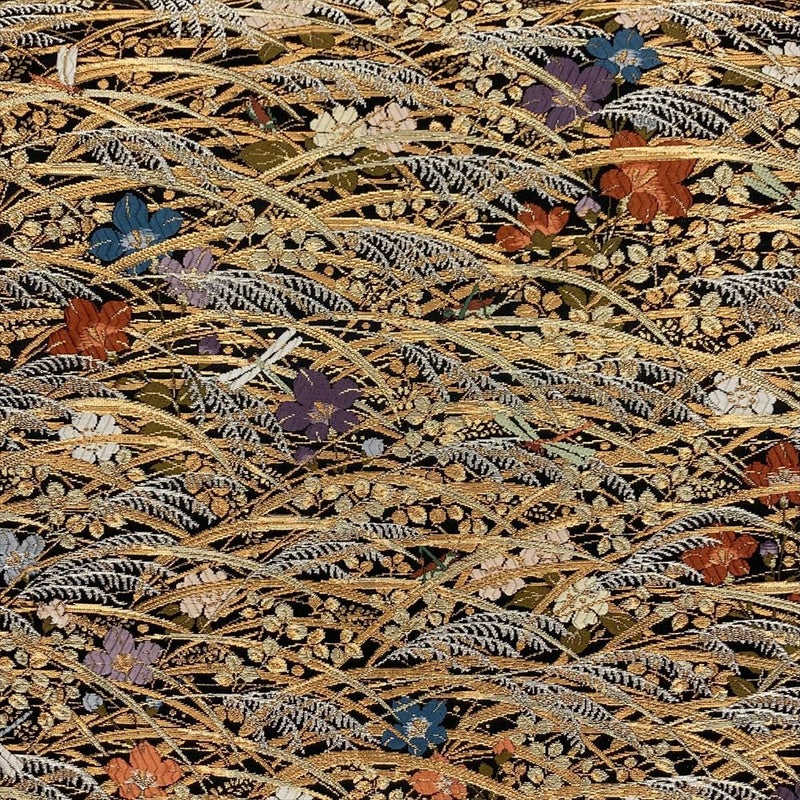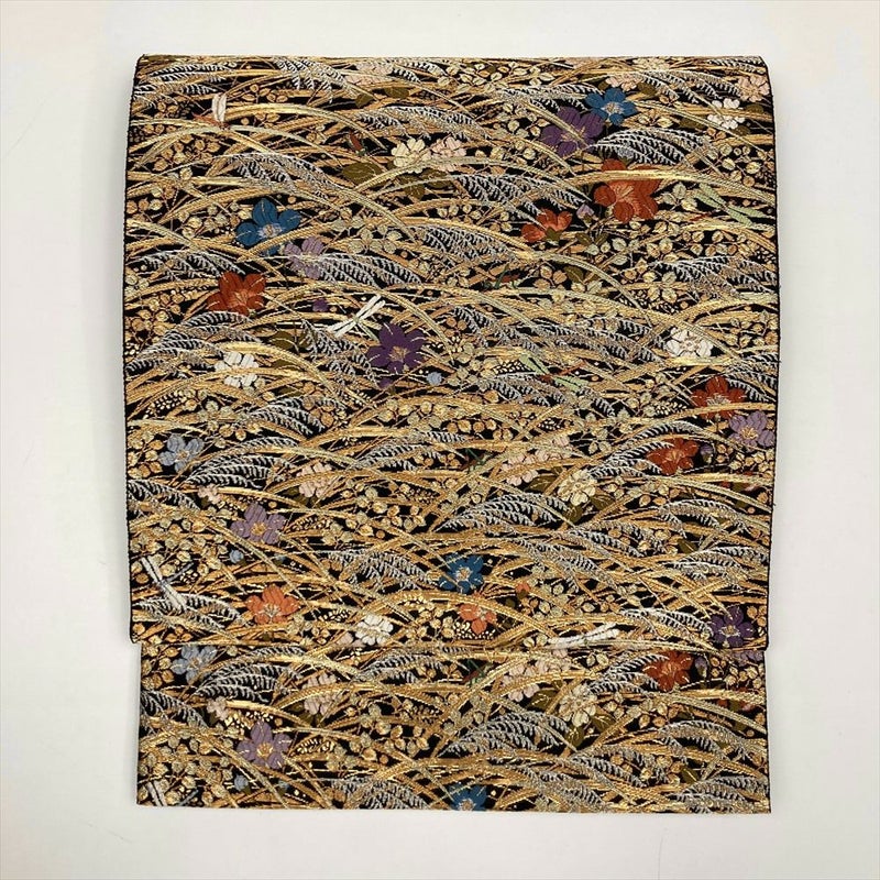 (中古)袋帯 黒 金 フォーマル セミフォーマル 六通 草叢 秋草に蜻蛉 飛蝗