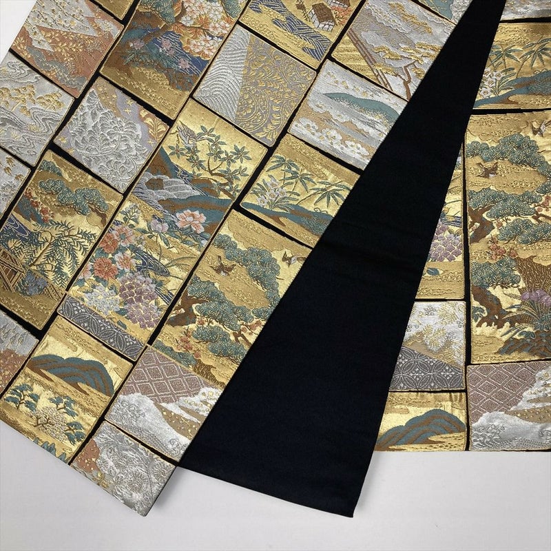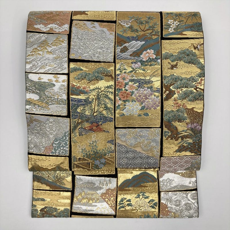(中古)袋帯 金 フォーマル セミフォーマル 六通 切箔 金糸 短冊に花鳥 石垣 吉祥文