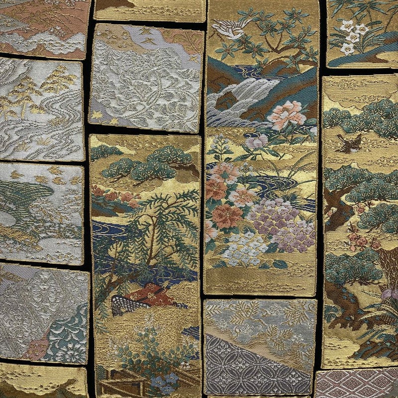 金系の帯は上品な光沢と高級感があります。フォーマルな着物に合わせると華やかさが引き立ち、セミフォーマルな着物に合わせると格調高さをプラスすることができます。たれ先に歌絵物語王朝飾栄文の表示がございます。