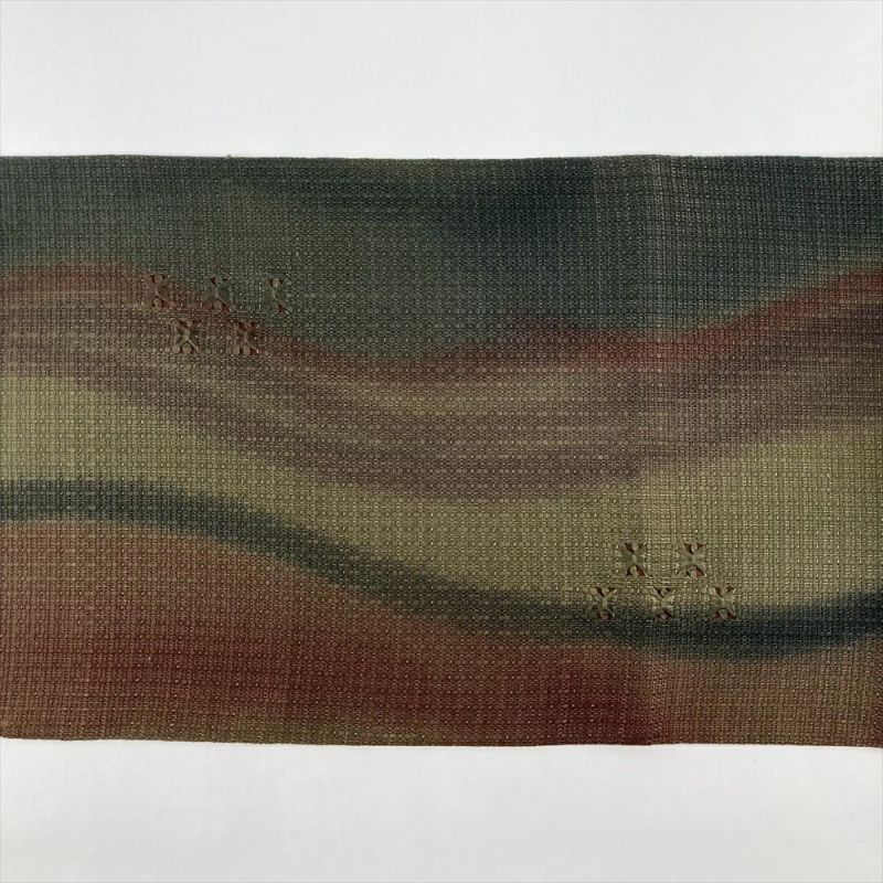 (中古)袋帯 緑 柳茶色 赤茶色 カジュアル 六通 織り 色糸 抽象柄