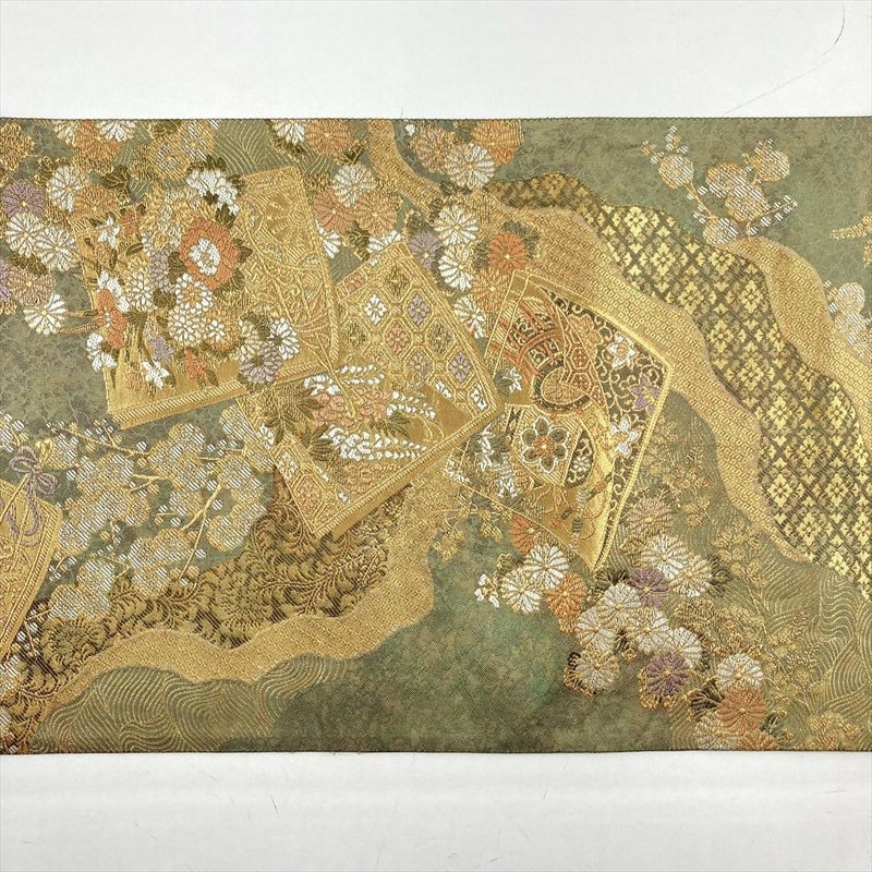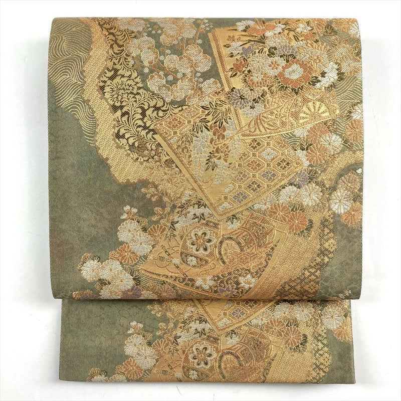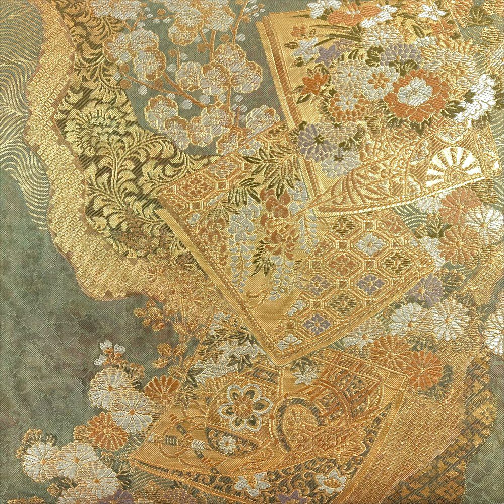 (中古)袋帯 灰緑 金 フォーマル セミフォーマル 六通 切箔 色紙 花車 和楽器 菱 七宝 蜀江 波