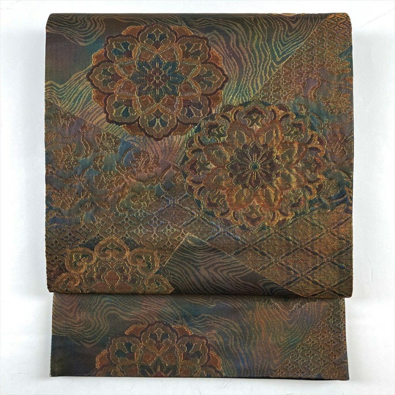 古くから愛される伝統的な模様がデザインされた帯は、オーソドックスで安定感があり、コーディネートの際には重宝いたします。リユース品としては良い状態ですので、まだまだ十分お使いいただけます。前柄、お太鼓の山付近に糸の飛び出しがございます。若干の使用感がございます。保存臭がややございます。縫い取りあり。
