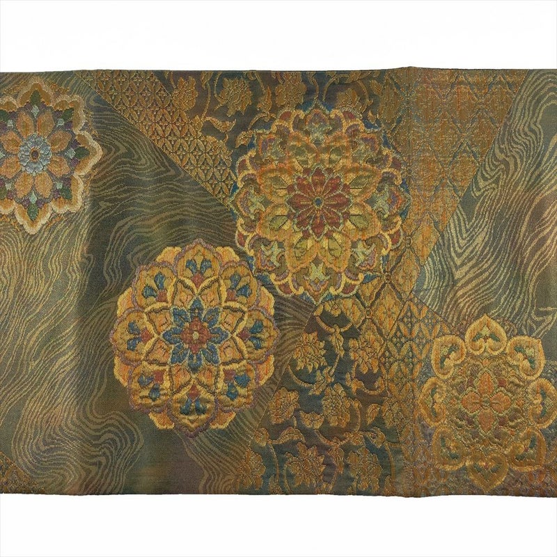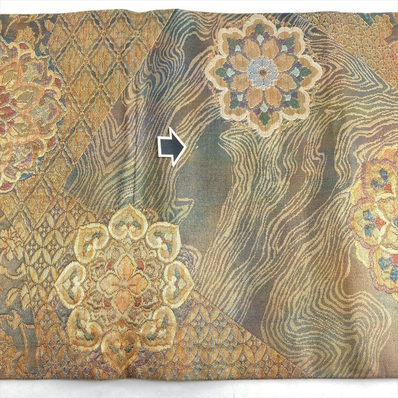 (中古)袋帯 金 玉虫色 フォーマル セミフォーマル 六通 切箔 切り嵌め 華文 蔓花 花菱 七宝