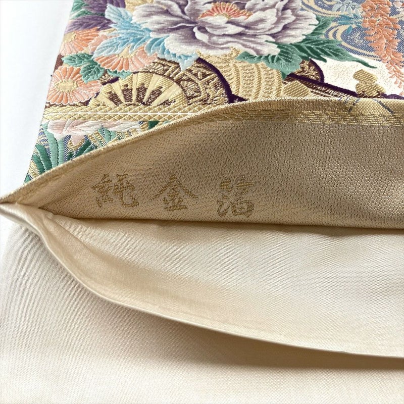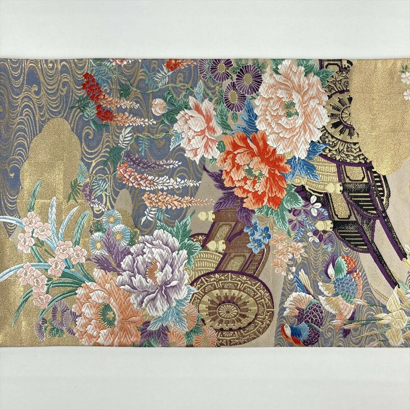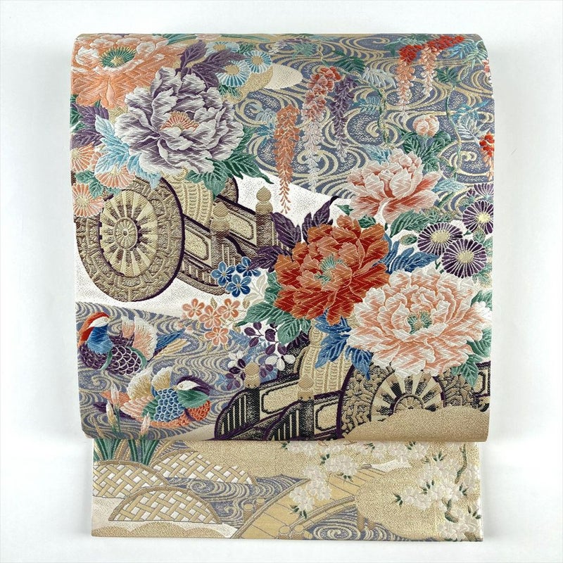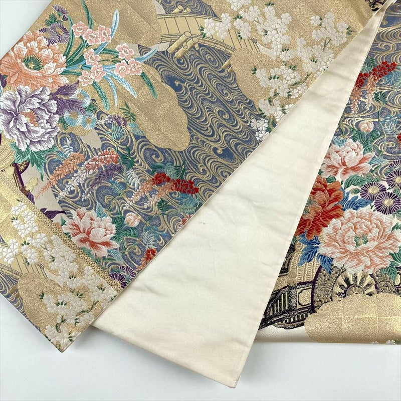 (中古)袋帯 金色 フォーマル セミフォーマル 六通 切箔 金糸 花車 四季花 蛇籠 流水 橋