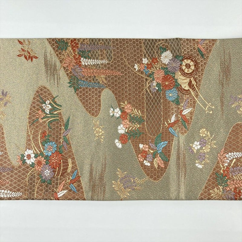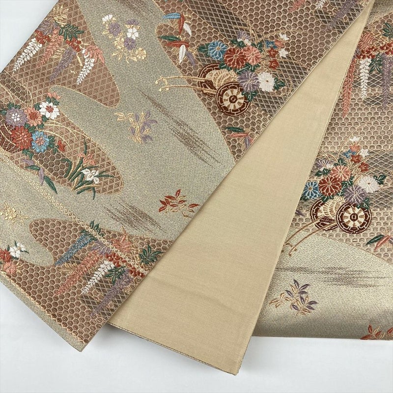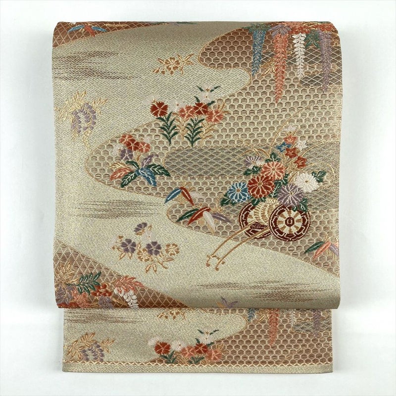 (中古)袋帯 金色 フォーマル セミフォーマル 六通 切箔 金糸 花車 四季花 霞 亀甲 菱