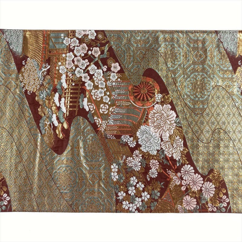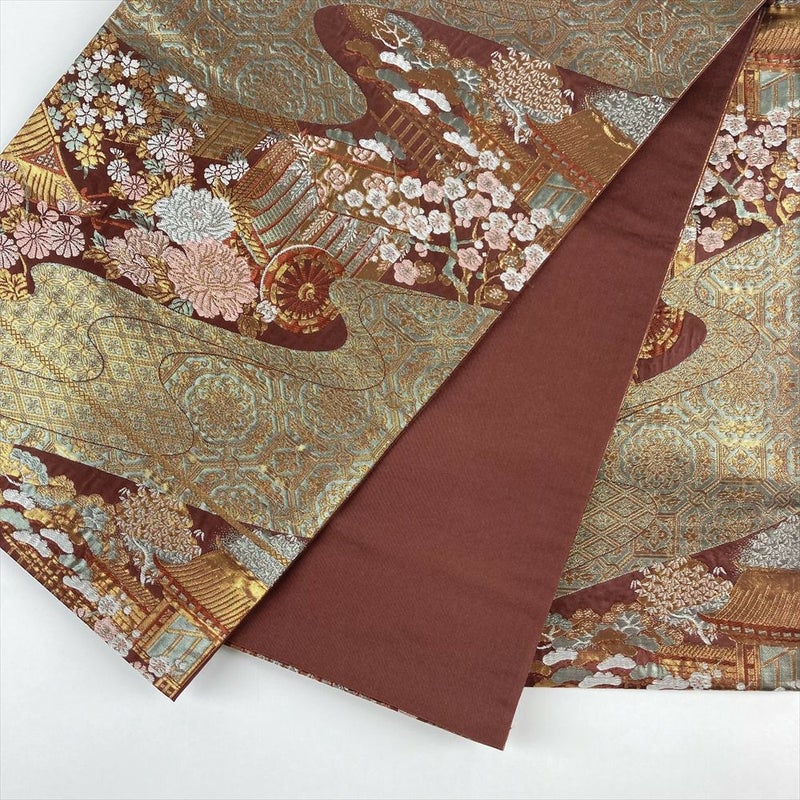 (中古)袋帯 赤茶色 フォーマル セミフォーマル 六通 切箔 平安絵巻 御所車 霞 吉祥文様