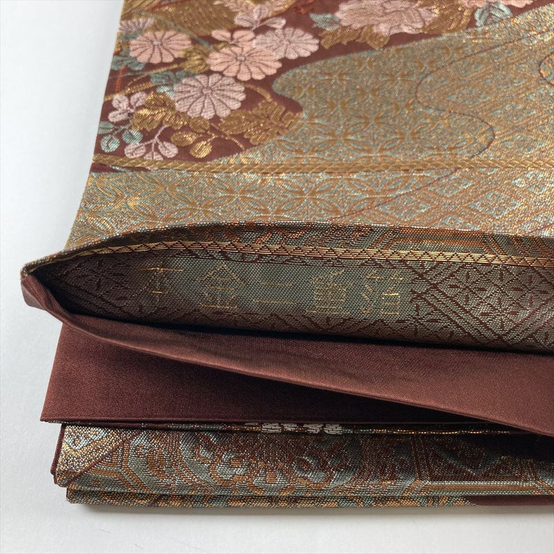 彩りが豊かで、さらに金銀の糸や箔を使用した袋帯は、織物の中でも格の高いものです。礼装用(振袖、留袖、訪問着など)にふさわしいとされています。こちらはこっくりとした配色で引き締まった印象です、リユース品ですが状態は良好ですので、すぐにお使いいただけます。たたみシワがございます。保存臭がややございます。たれ先に本金二重箔の縫い取りがございます。