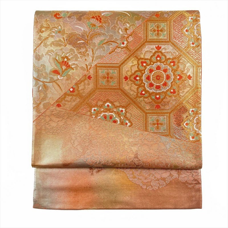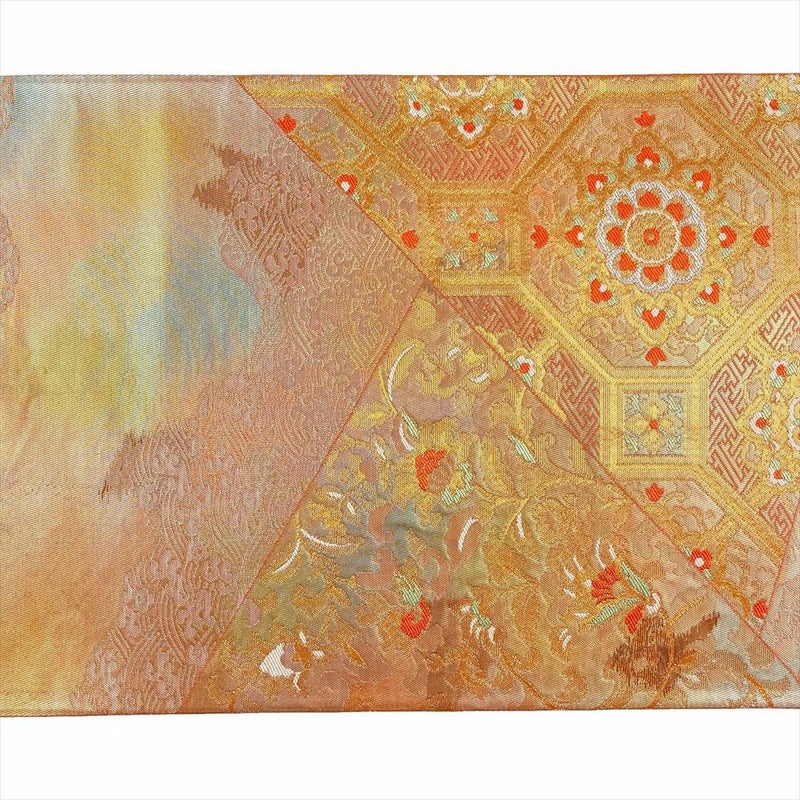 (中古)袋帯 金色 ピンク フォーマル 六通 切箔 唐花 蜀江華文 波頭