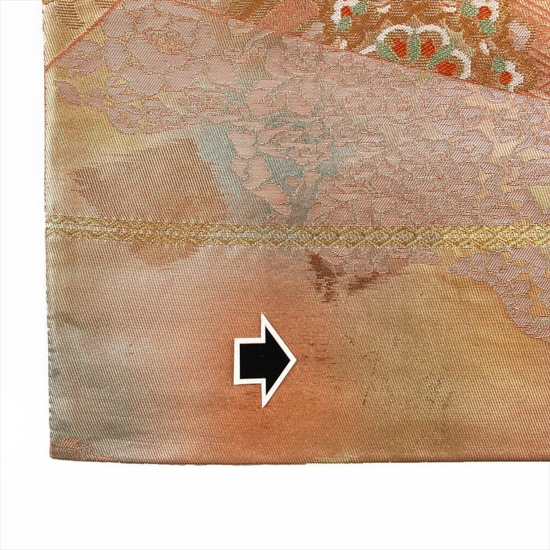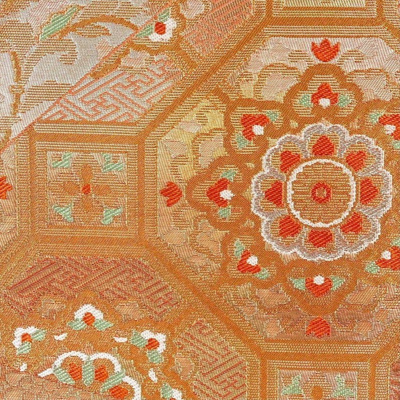 独特の織り文様が特徴の「名物裂」に多くみられる「華文」「蜀江文」「唐花」などの文様は、正倉院に納められたものにもみられ、古くから織物、染め物の文様として用いられてきました。古来日本で愛されてきた文様をあらわしているので時代に左右されない美しさがあります。たれ先に箔の劣化がございます保存臭がややございます。