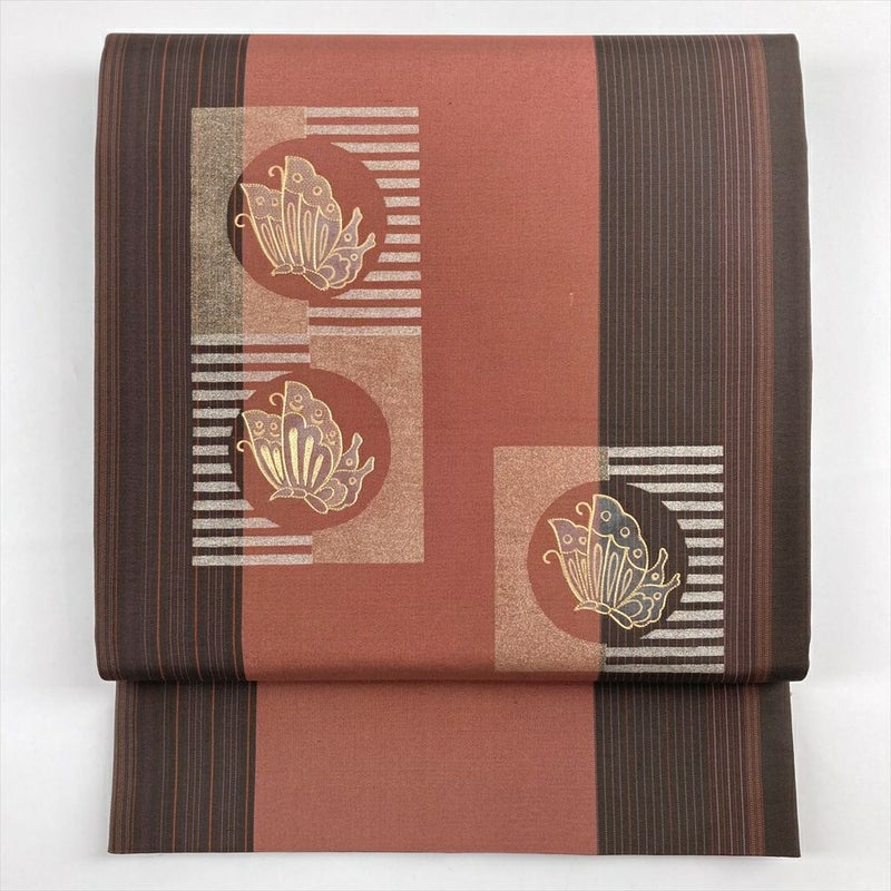 (中古)袋帯 薄赤茶色 カジュアル 六通 織り 金彩 刺繍 変わり間道 蝶