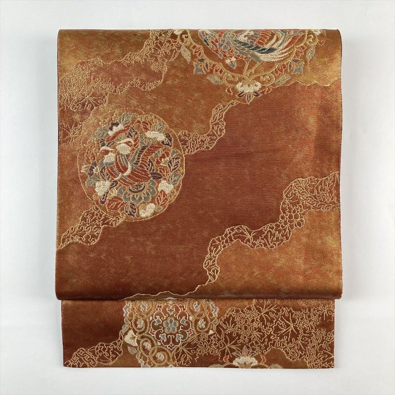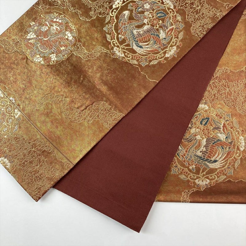 (中古)袋帯 赤銅色 茶色 フォーマル セミフォーマル 六通 切箔 金糸 銀糸 鳳凰文 華文 天平文様 道長取り