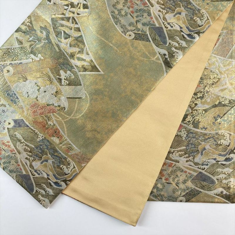 (中古)袋帯 金色 フォーマル セミフォーマル 六通 切箔 巻物 花鳥 波 琳派調
