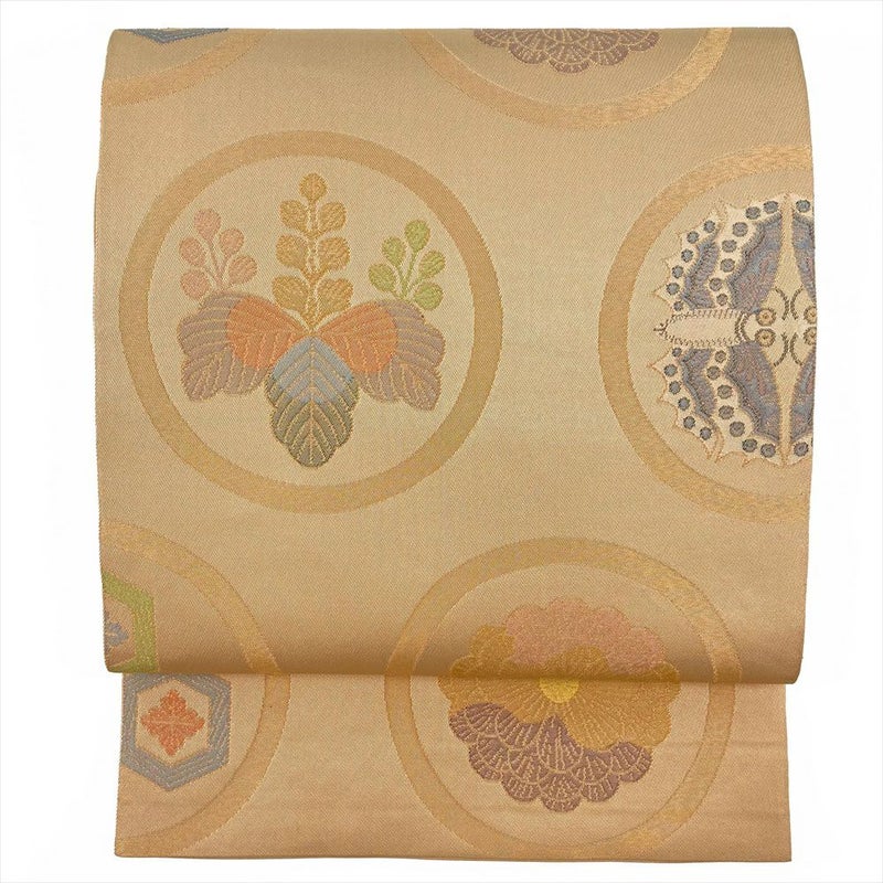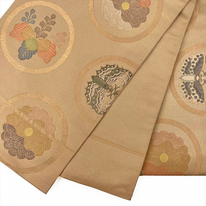(中古)袋帯 蜂蜜色 ベージュ フォーマル 全通 金糸 丸文 菊 桐 蝶