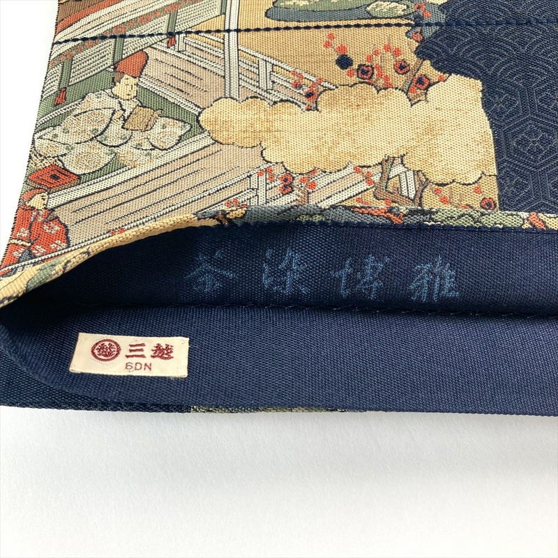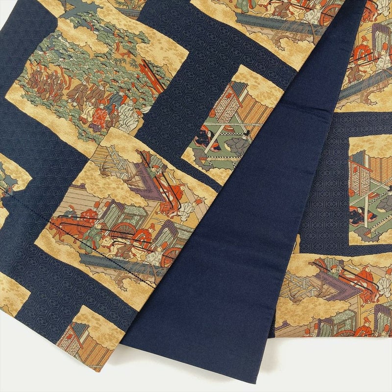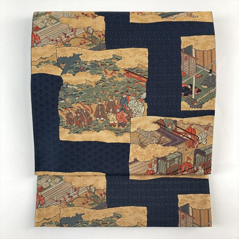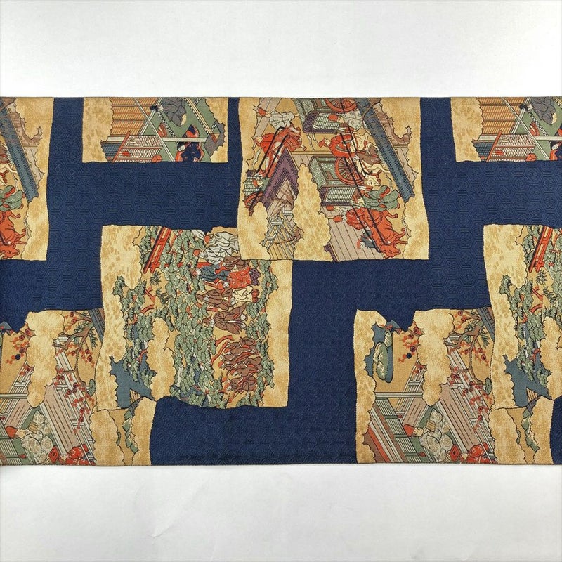 (中古)袋帯 濃紺色 カジュアル 六通 織り 破れ色紙 平安絵巻