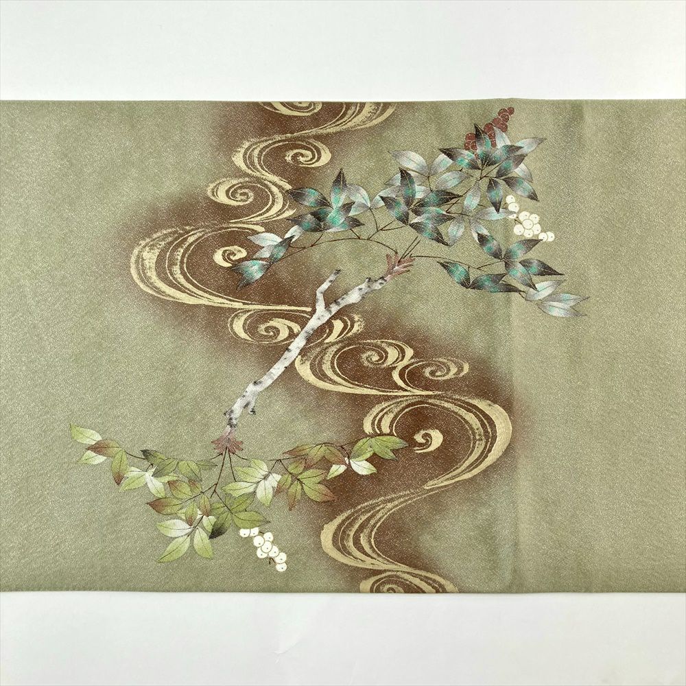 (中古)袋帯 薄緑色 セミフォーマル カジュアル 六通 銀通し 染め 金彩 紅白南天 流水