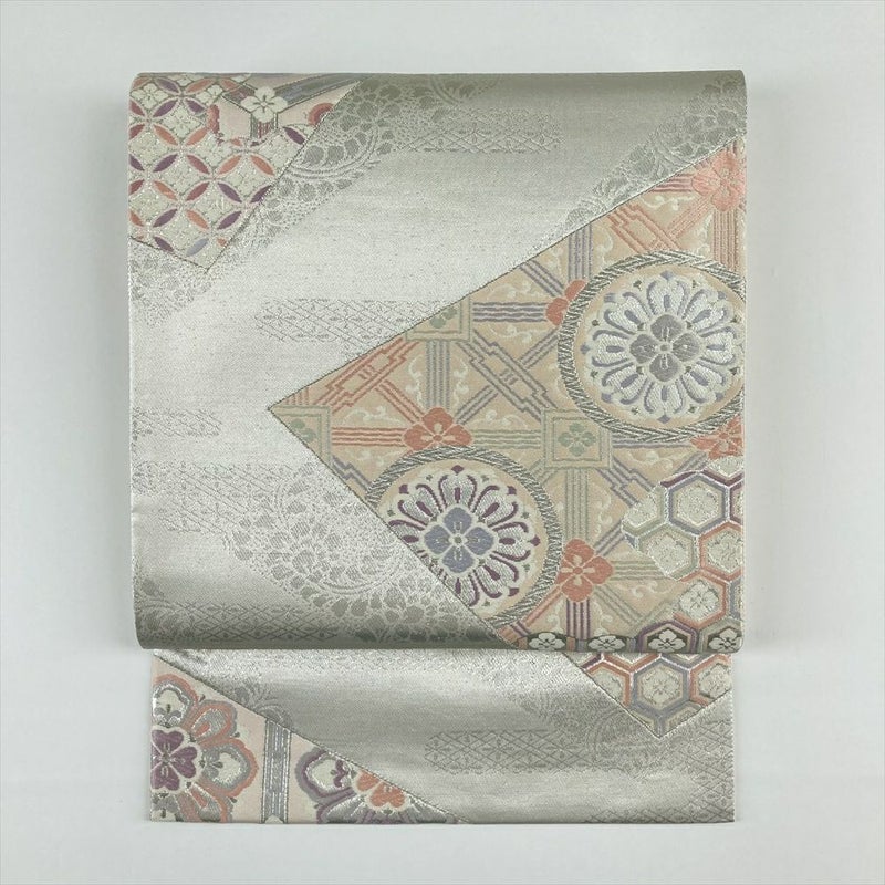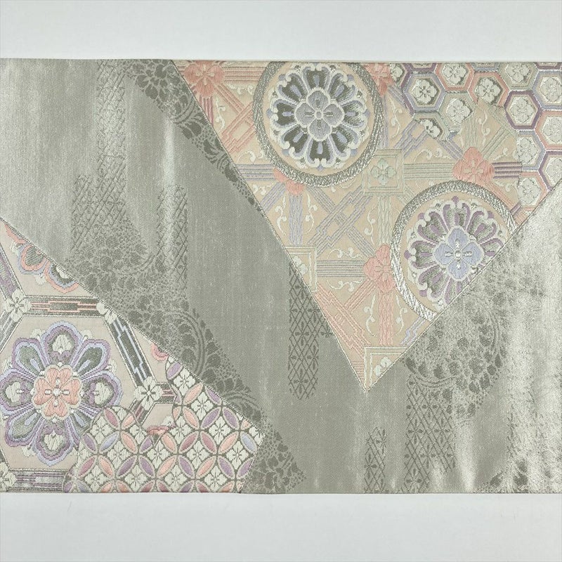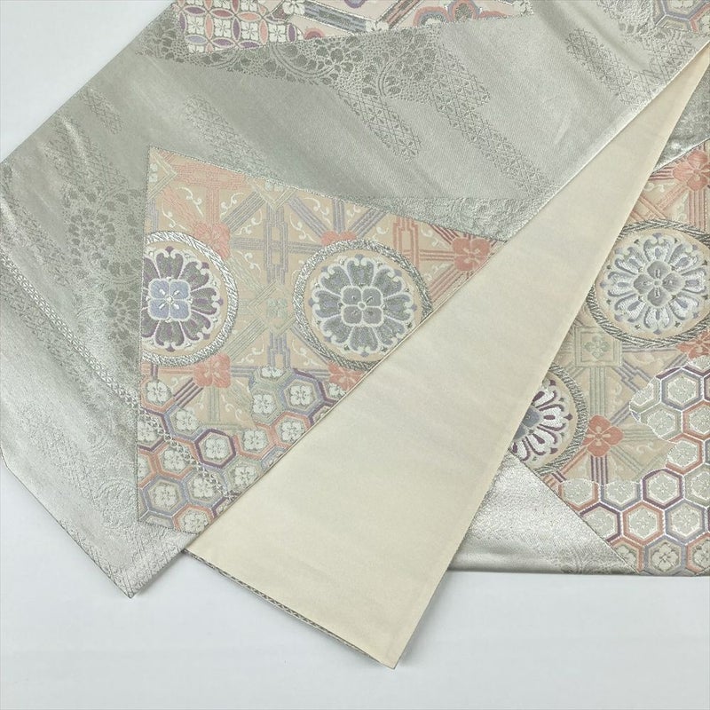 (中古)袋帯 銀色 フォーマル セミフォーマル 六通 切箔 銀糸 丸文 亀甲華文 蜀江錦 霞