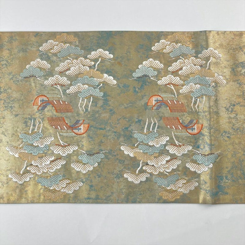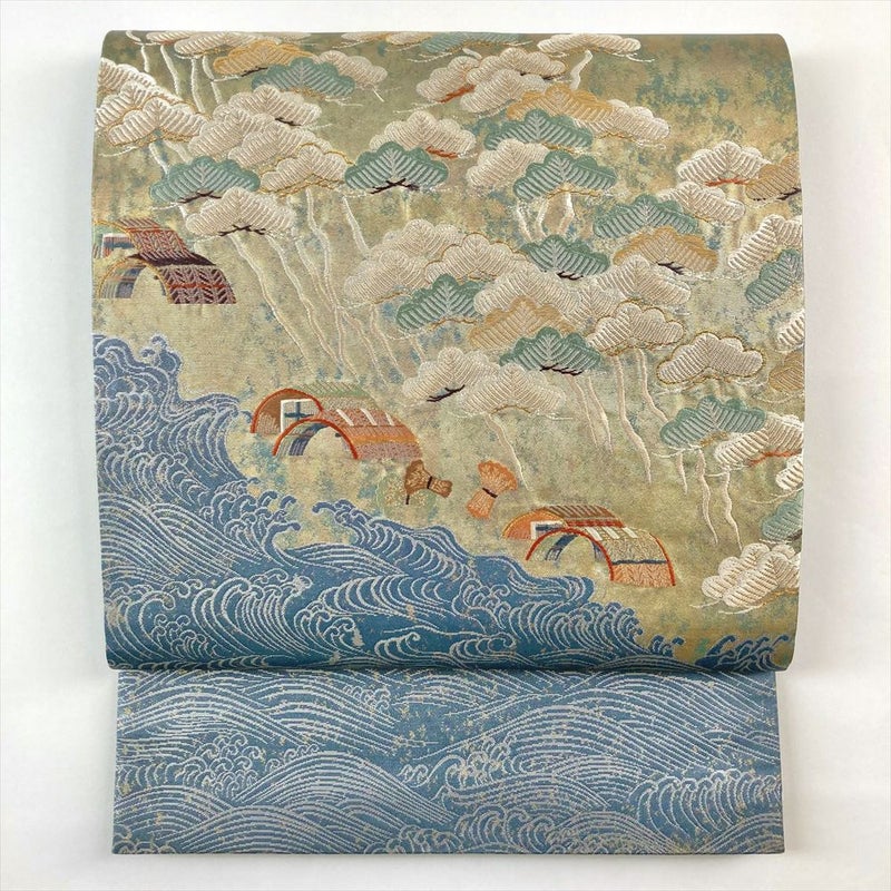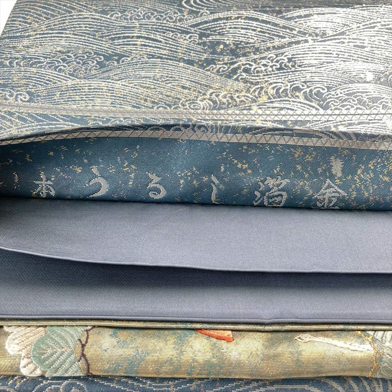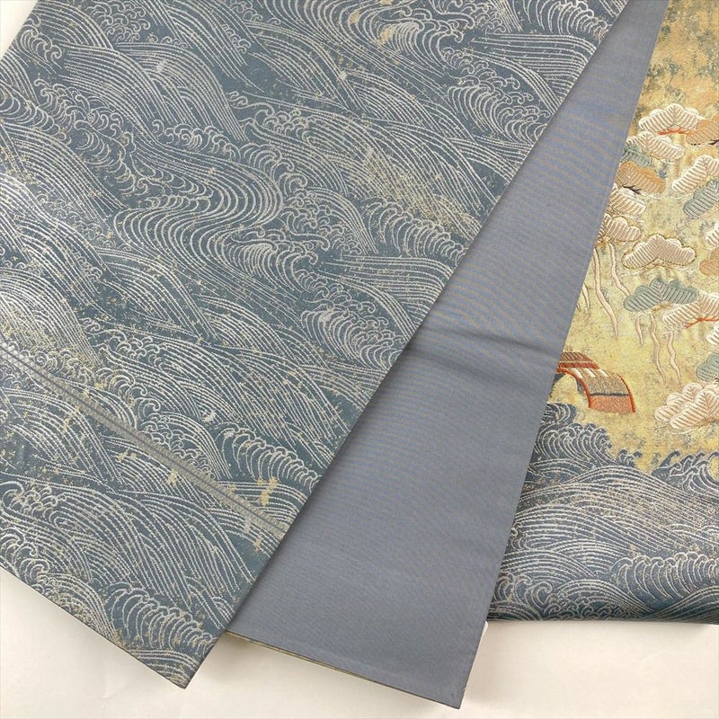 (中古)袋帯 灰青色 ブルーグレー フォーマル 六通 切箔 金糸 銀糸 松 波