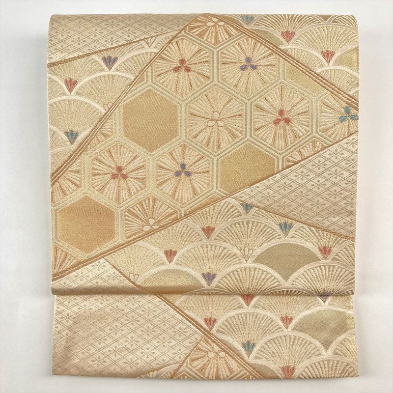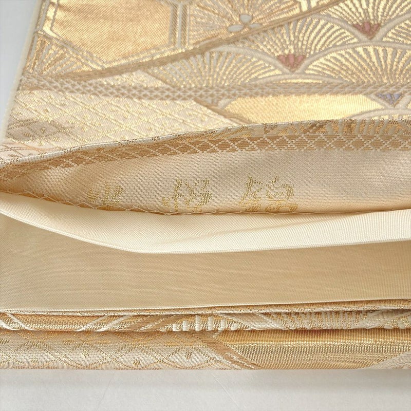 (中古)袋帯 金色 フォーマル 六通 織り 引き箔 切り嵌め 青海波 亀甲 菱
