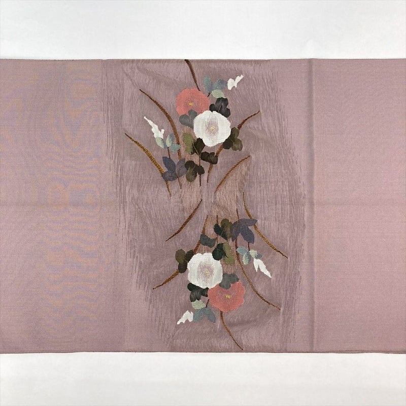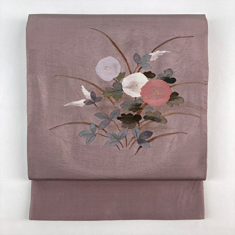 (中古)袋帯 灰桜色 ピンク色 紫色 カジュアル 六通 織り 金糸 色糸 つづれ調 四季花