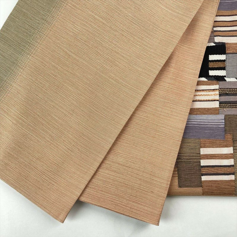 (中古)袋帯 薄茶色 カジュアル 六通 織り 色糸 幾何学柄