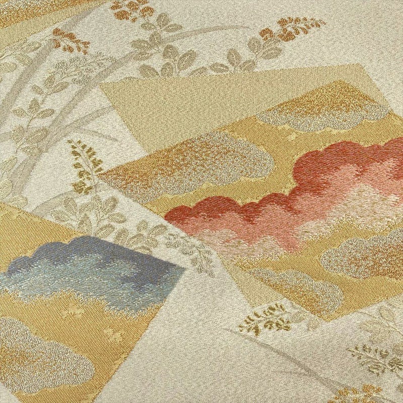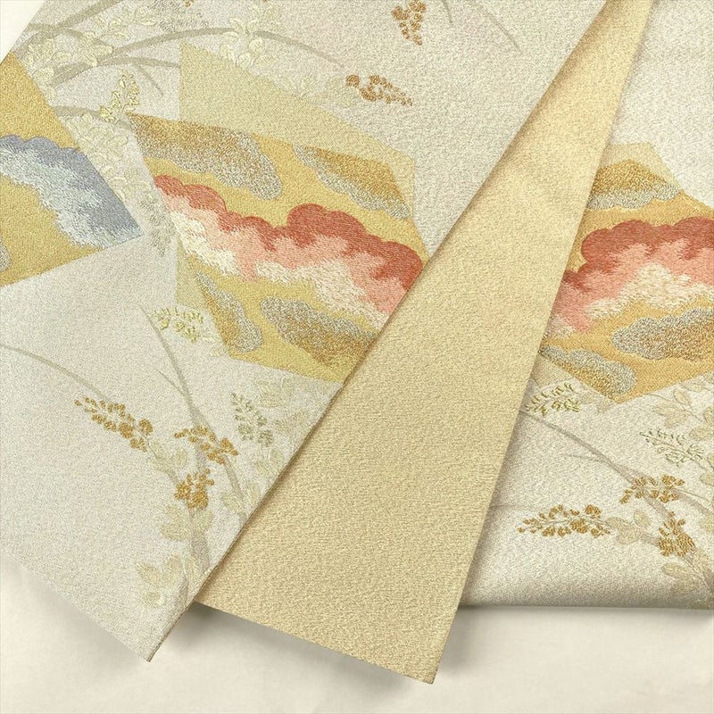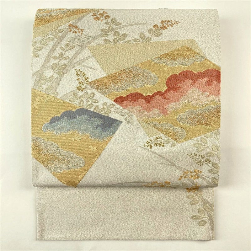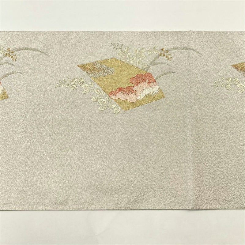 (中古)袋帯 銀色 セミフォーマル 六通 織り 金糸 銀糸 色紙 雲 秋草