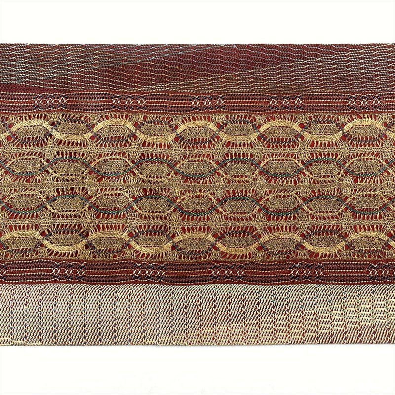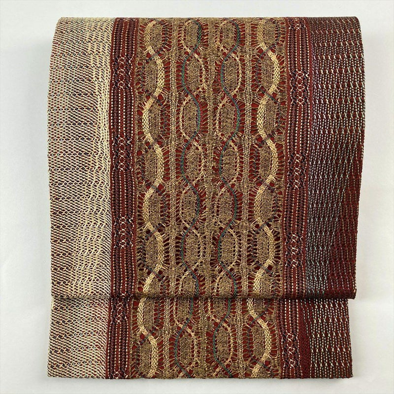 (中古)袋帯 臙脂色 赤茶色 カジュアル 六通 織り 金糸 組織り調