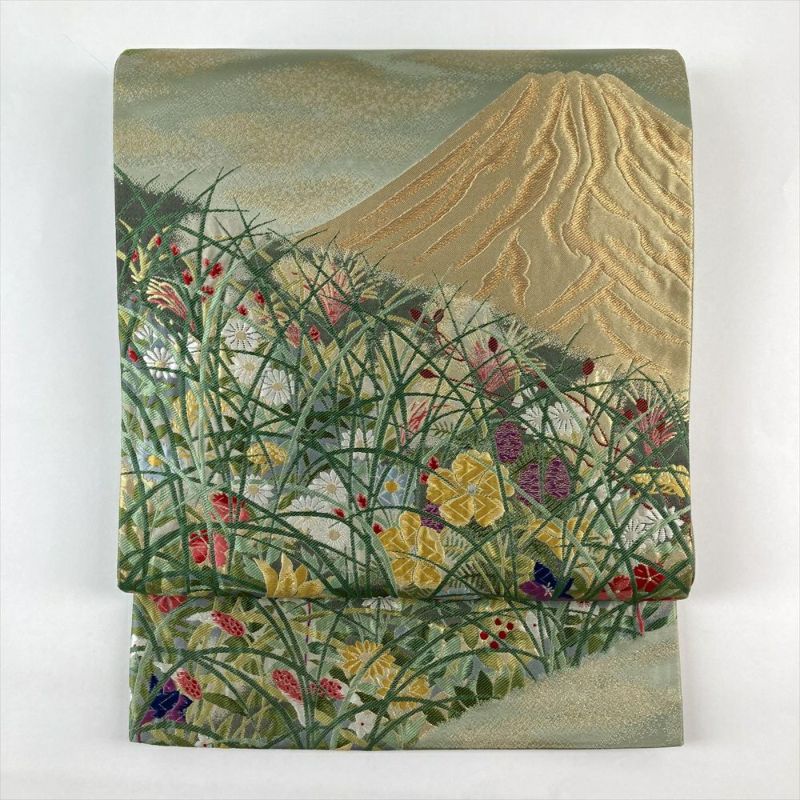 (中古)袋帯 緑色 フォーマル 六通 織り 引き箔 金糸 色糸 富士山 野に咲く花 蝶